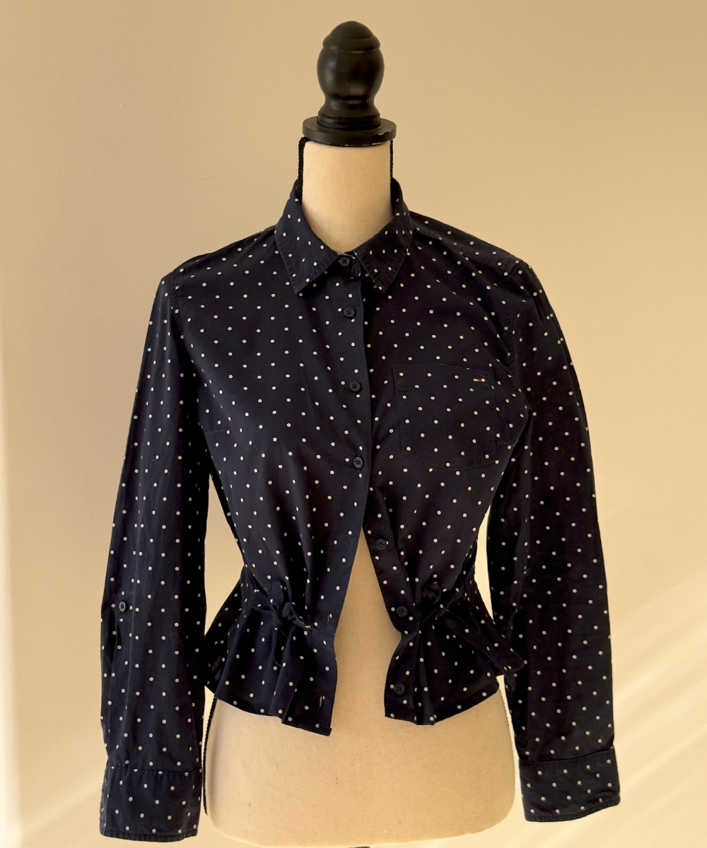 Del archivo a tu clóset: añadimos dos amarres para ajustar a tu cintura en estas camisas en desuso. Puedes manipularlos como más te guste.