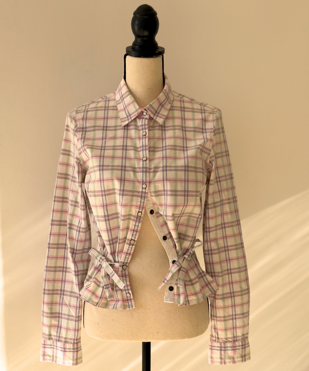 Del archivo a tu clóset: añadimos dos amarres para ajustar a tu cintura en estas camisas en desuso. Puedes manipularlos como más te guste.