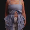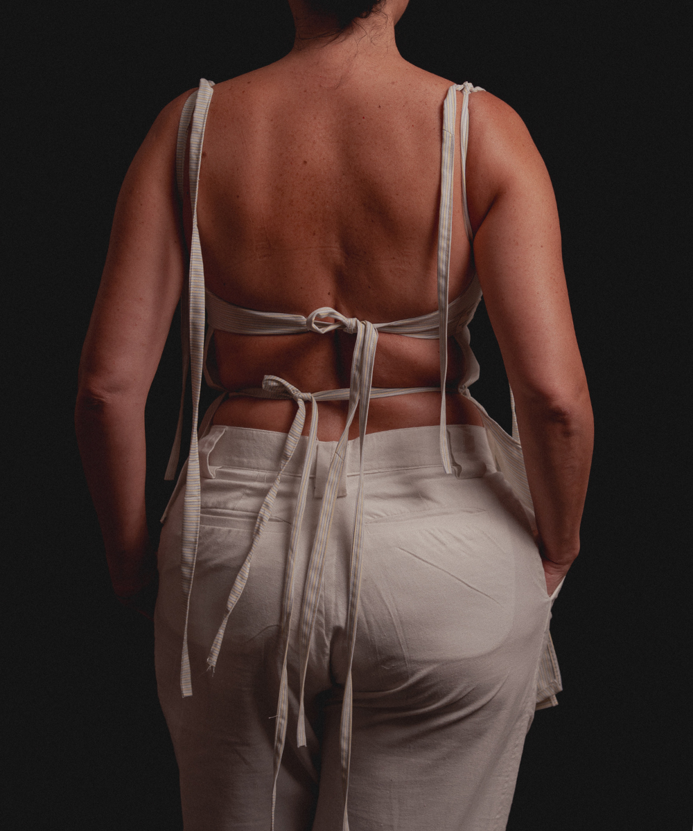 A partir de una camisa tradicional de manga larga y cuello clásico, reconstruimos el patrón para desarrollar una silueta renovada. Incorporamos pinzas en el busto que definen la forma, junto a un sistema de amarres en la espalda que permite un ajuste preciso y adaptable, pensado para acompañar el cuerpo con comodidad.