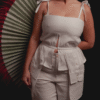 Intervenimos la cintura con frunces que aportan volumen y movimiento, mientras que las tiras en los hombros optimizan el calce en busto y hombros.