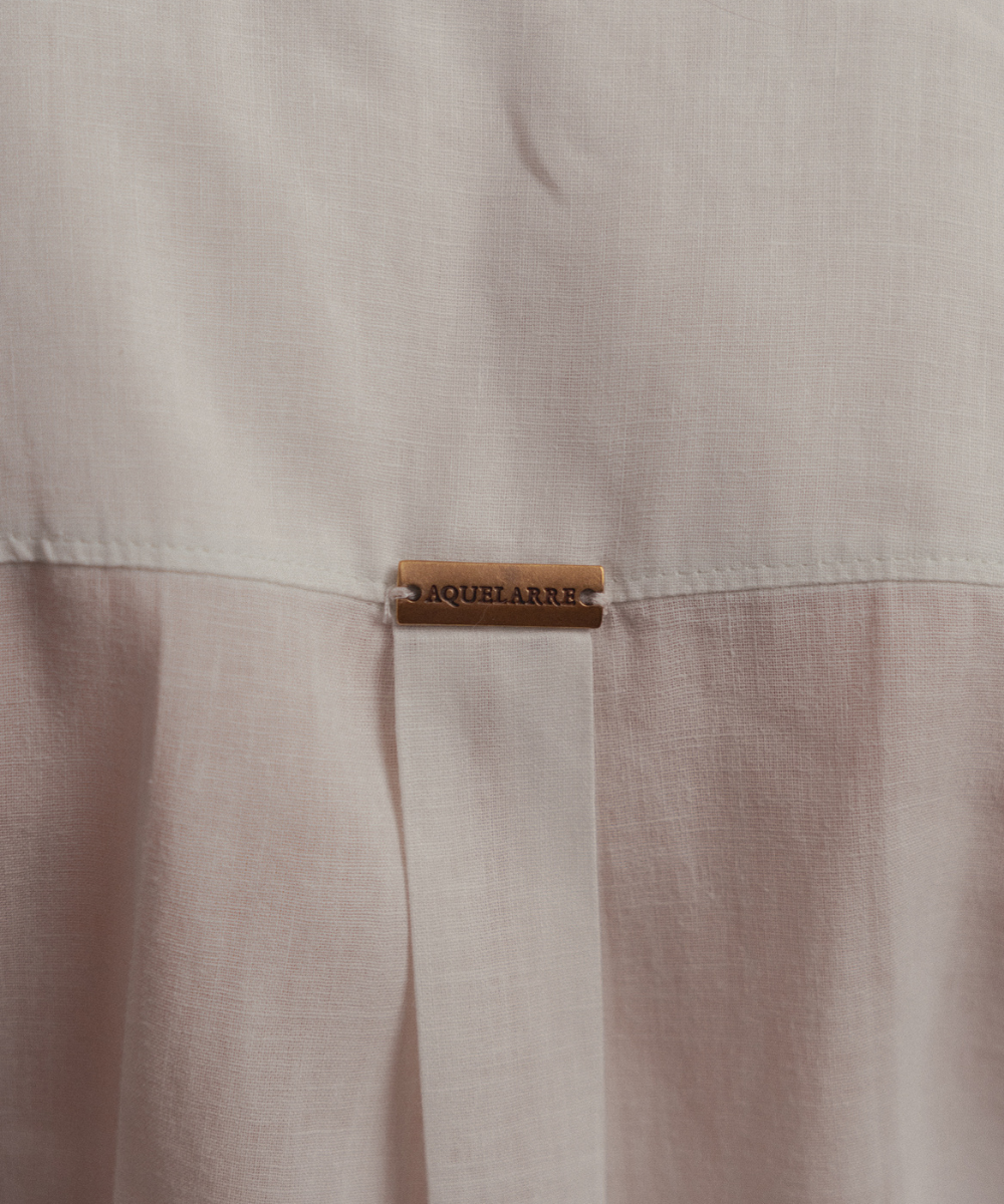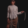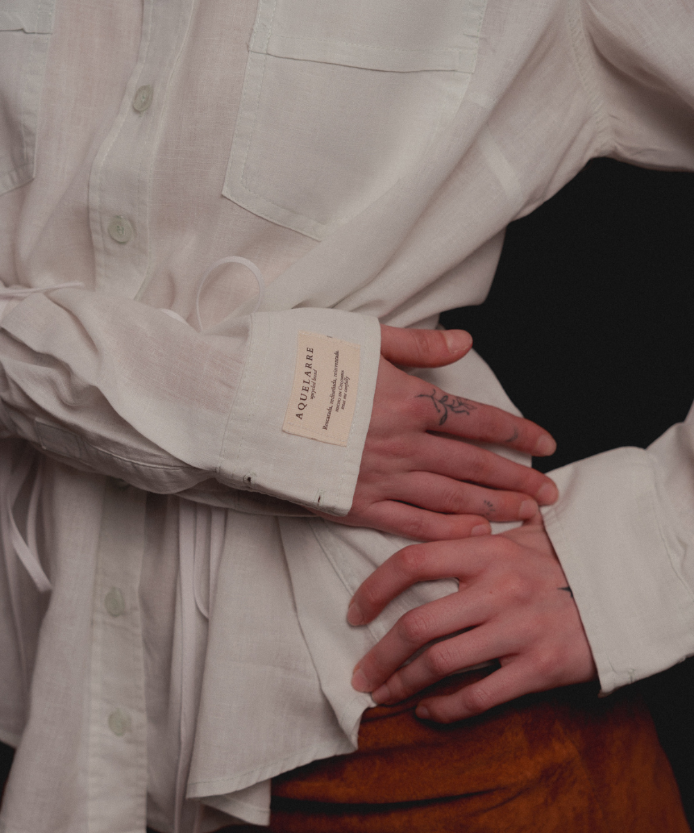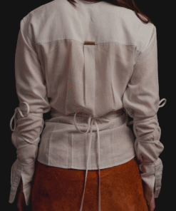 A partir de una camisa tradicional de cuello clásico, readaptamos la estructura para introducir volumen a través de amarres. Esta pieza retoma la base de nuestra camisa Bow y la reinterpreta mediante el contraste de sesgos en tonos que pueden combinar o destacar dentro del diseño.
