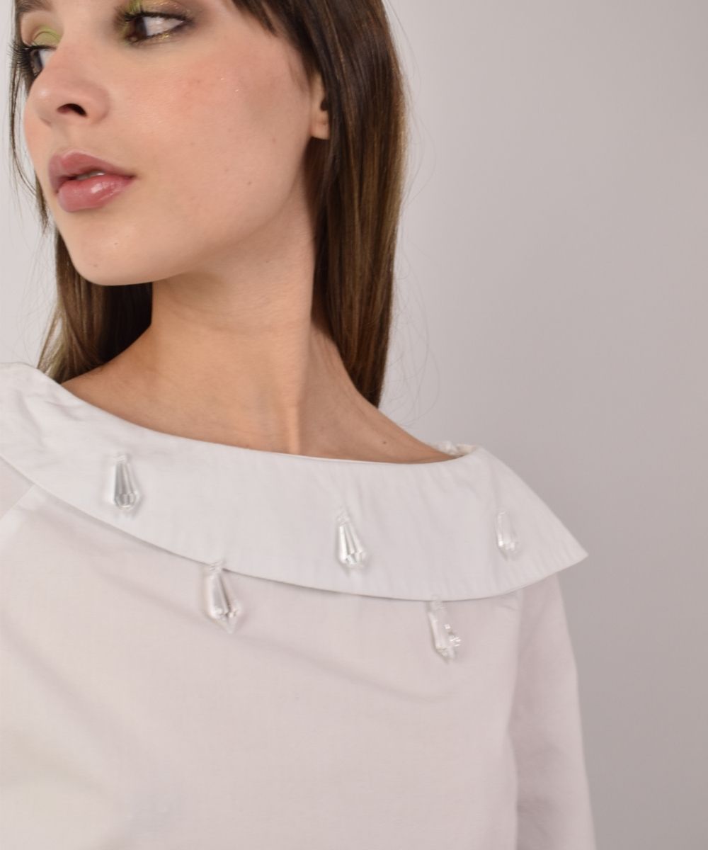 A esta camisa solo le añadimos resortes en los laterales para darle un poco de textura, agregamos a mano cristales al rededor del cuello. Un toque de fina coquetería.