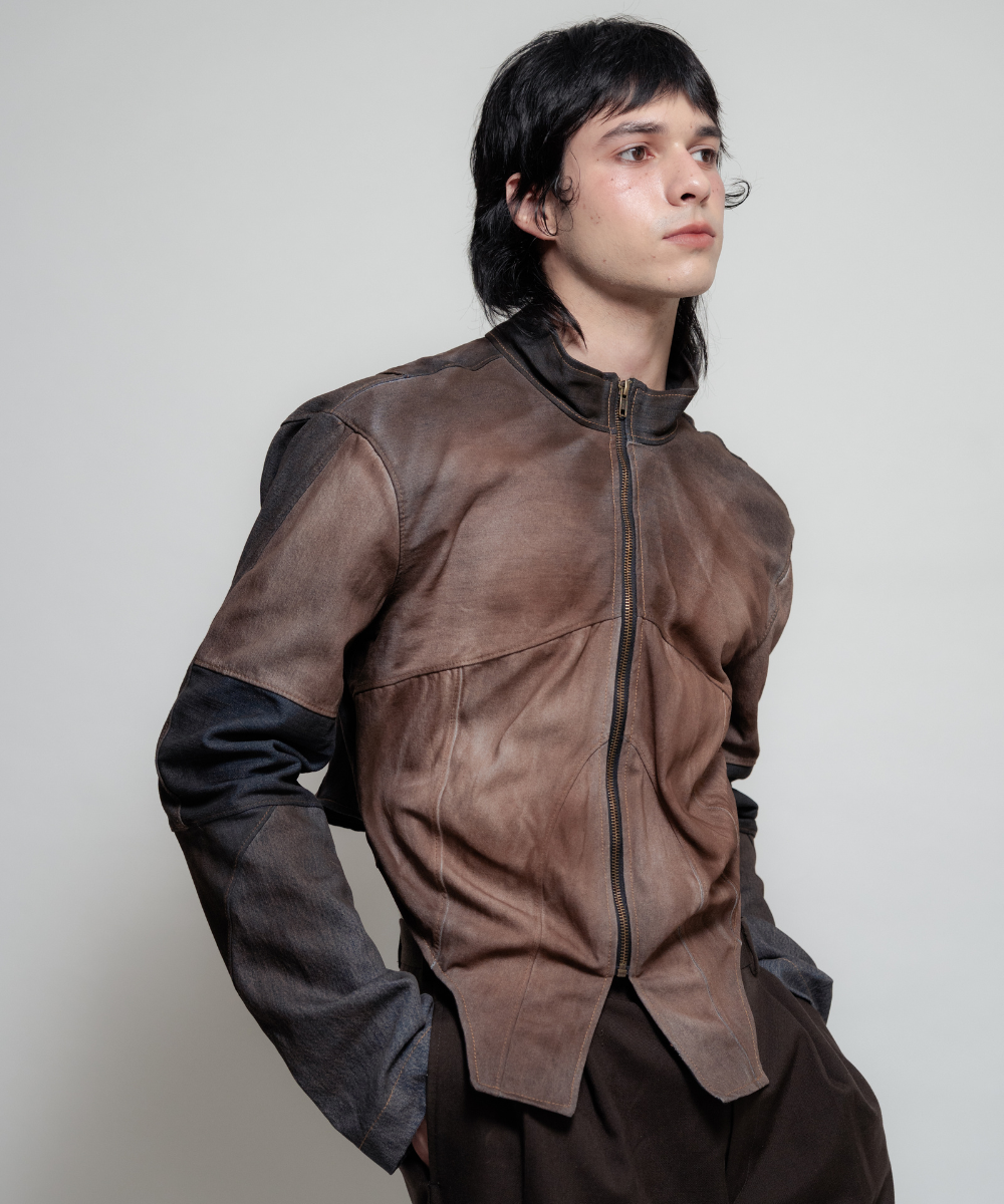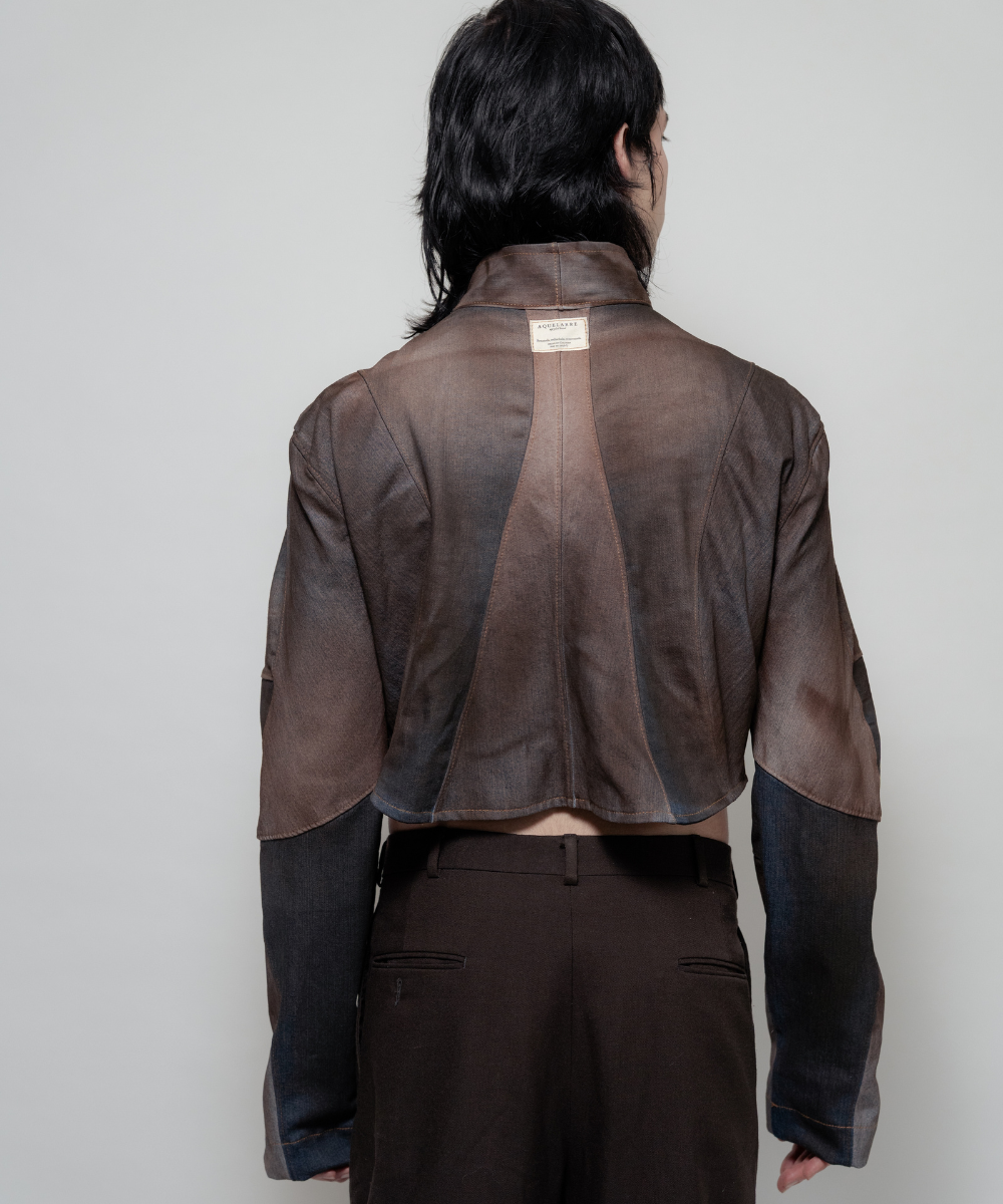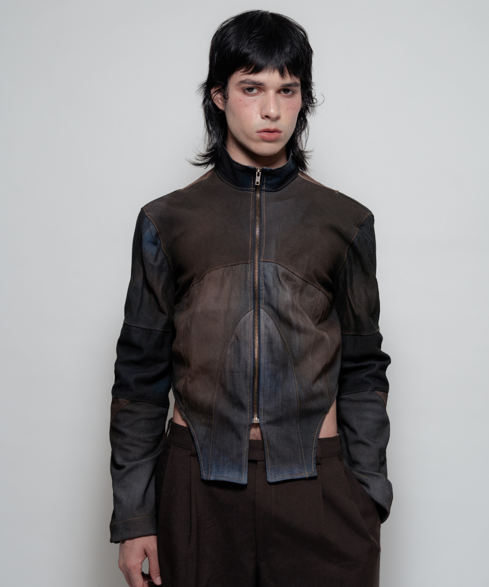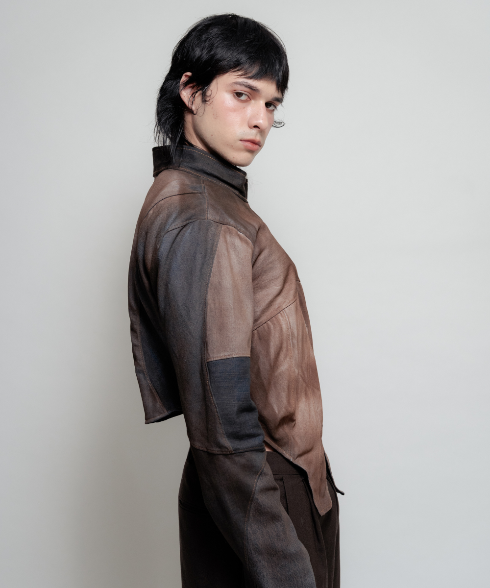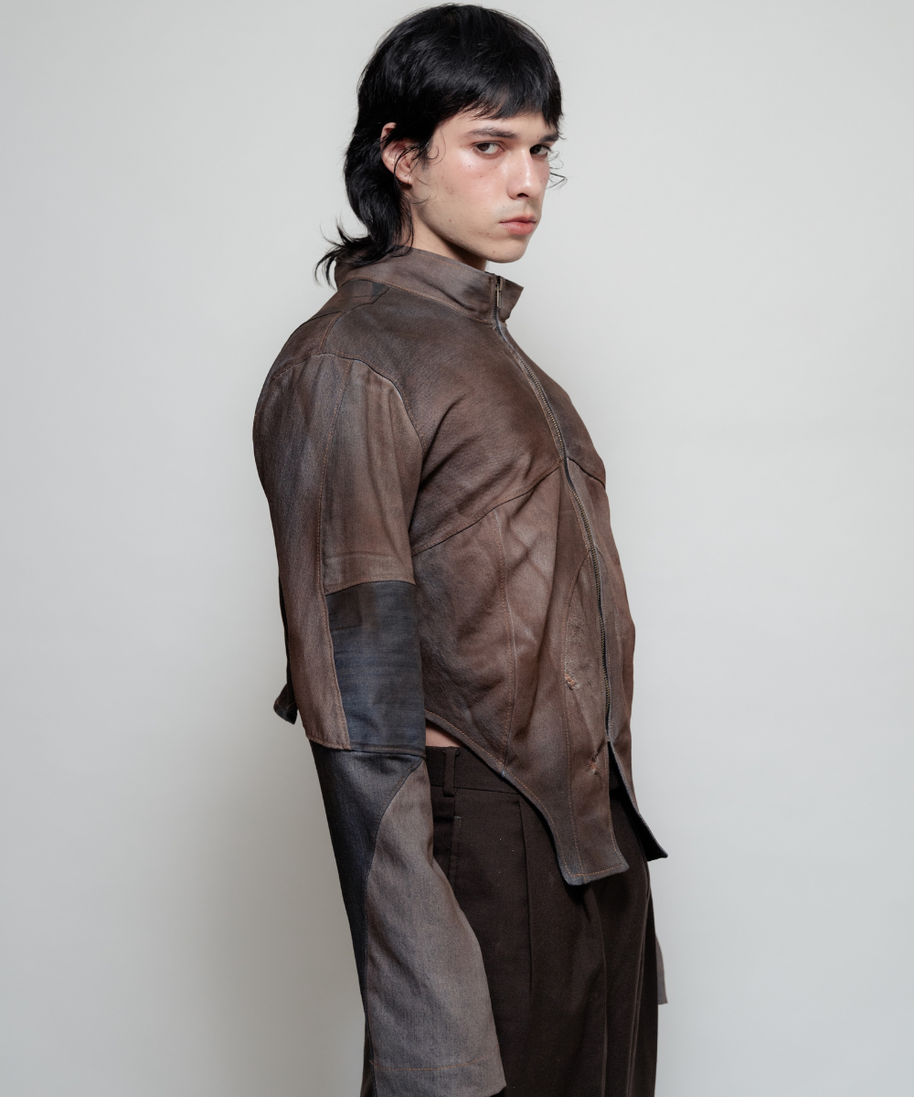 Nuestra primera chaqueta nace de jeans despiezados, repatronados, trabajados con tintes, desgastes y acabados que resaltan la autenticidad del denim.