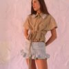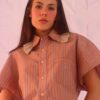 Hecha a partir de pantalones y camisas básicas. A la falda le conservamos la pretina del pantalón, le dimos vuelo con las botas y le sumamos un toque de camisa en el bajo para un detalle coqueto. La camisa original la ajustamos con tiras para marcar la cintura y le añadimos un rufle en el cuello que la hace única. En algunos, el puño antiguo se convirtió en detalle en el bolsillo trasero.