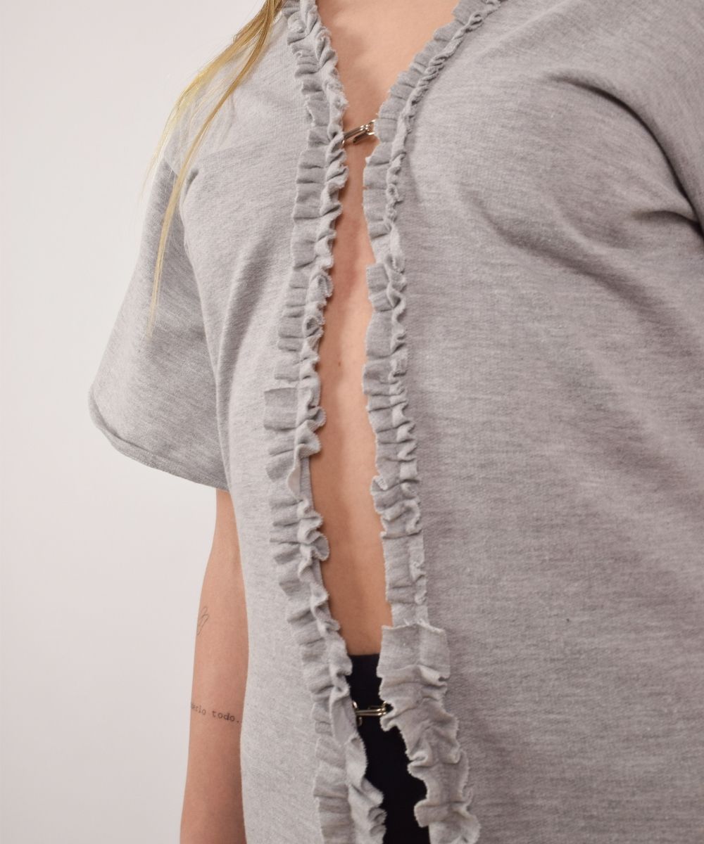 De esta capa rescatamos varias tiras para construir frunces en toda la parte del escote. Amamos que parecen ondas pequeñas que decoran esta pieza que puede funcionar como top largo para combinar con todos tus bottoms.
