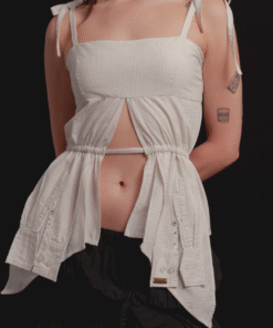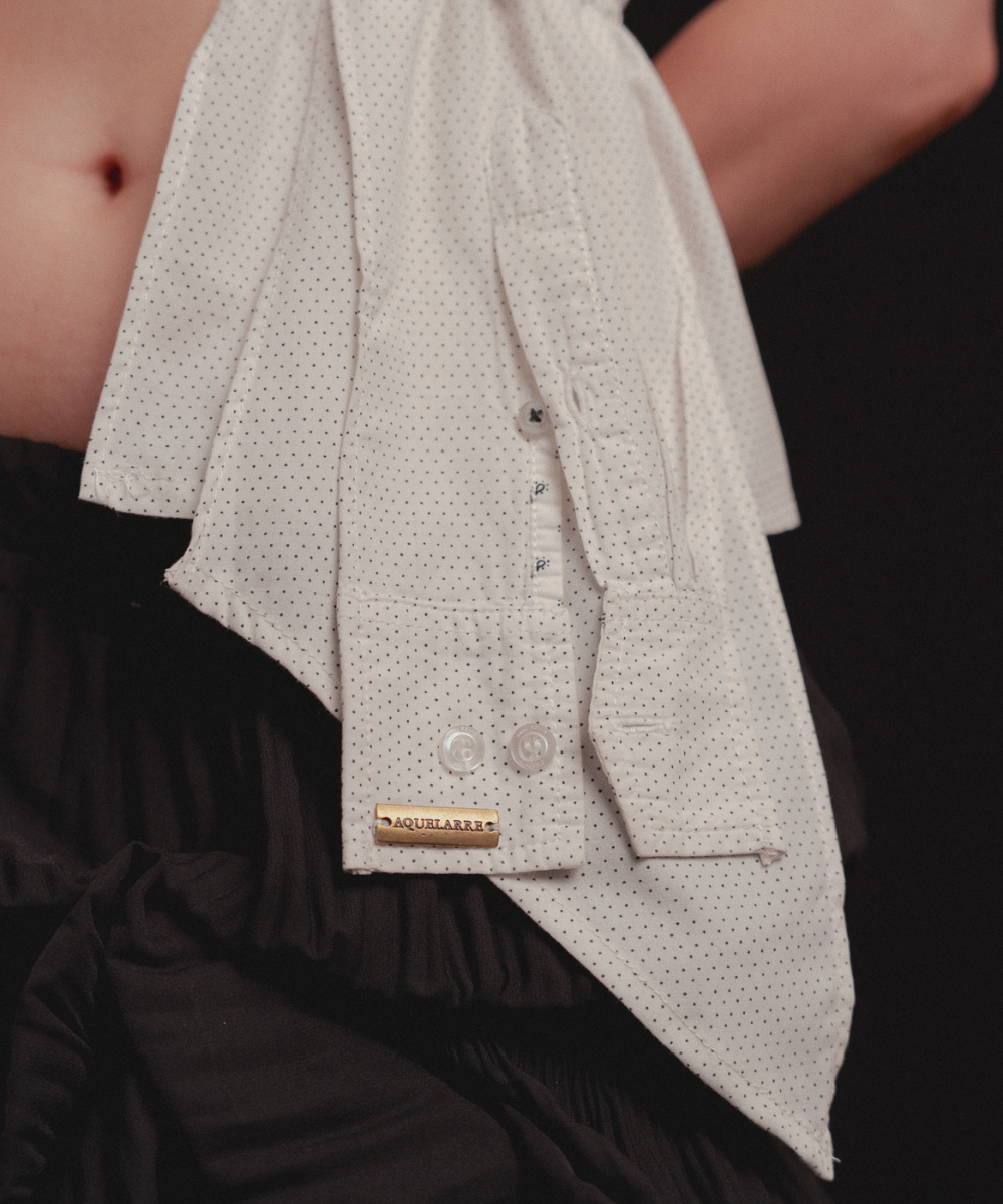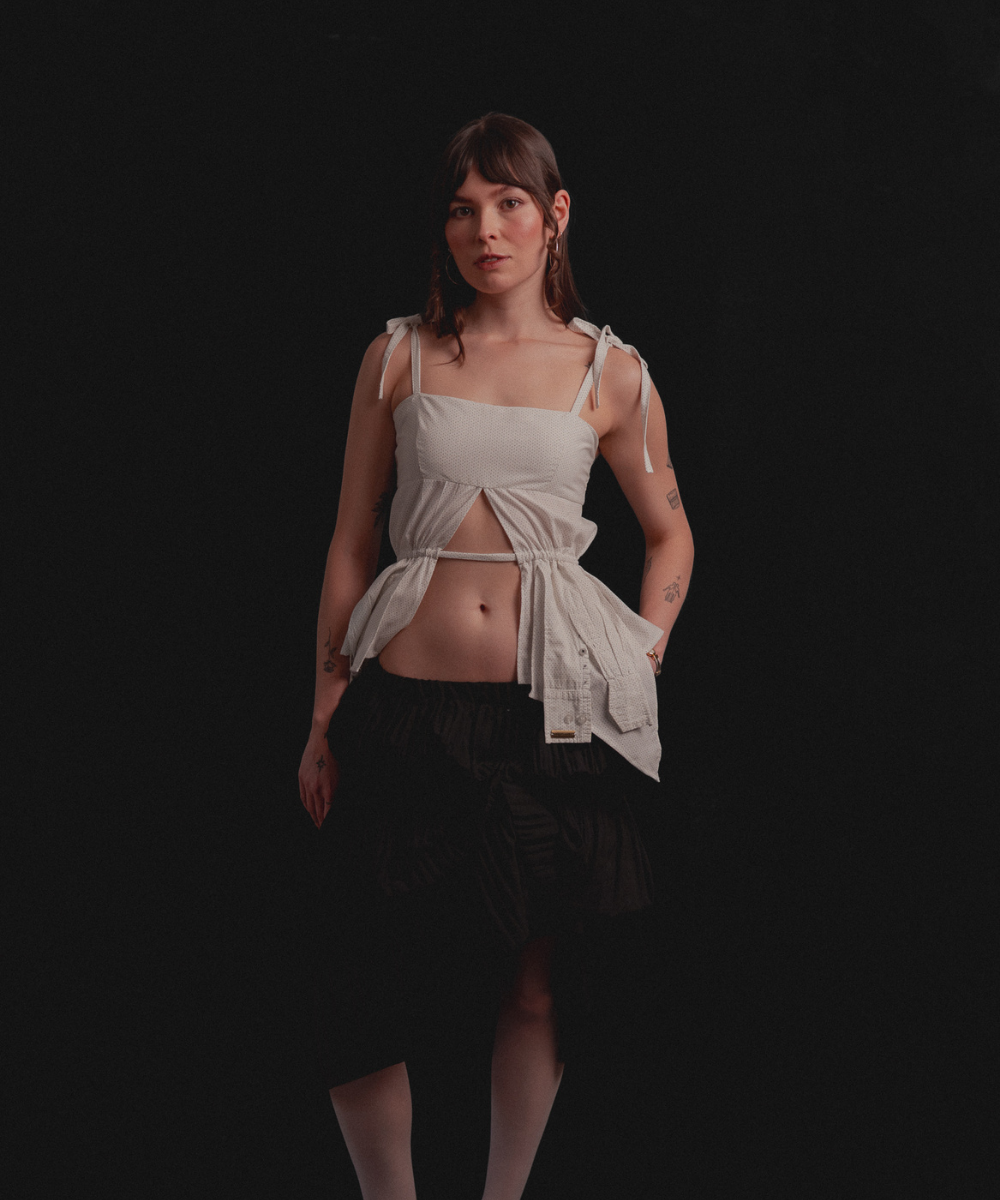 A partir de una camisa tradicional de manga larga y cuello clásico, reconstruimos el patrón para desarrollar una silueta renovada. Incorporamos pinzas en el busto que definen la forma, junto a un sistema de amarres en la espalda que permite un ajuste preciso y adaptable, pensado para acompañar el cuerpo con comodidad.