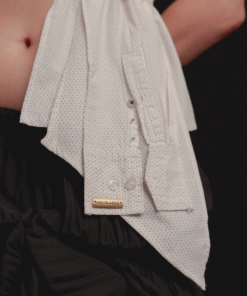 Conservamos el textil original y lo reinterpretamos para proponer una nueva lectura de la prenda. Los puños se desplazan de su lugar tradicional y se integran de forma inesperada, introduciendo contraste dentro del diseño.