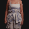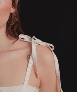 Intervenimos la cintura con frunces que aportan volumen y movimiento, mientras que las tiras en los hombros optimizan el calce en busto y hombros.