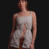 Intervenimos la cintura con frunces que aportan volumen y movimiento, mientras que las tiras en los hombros optimizan el calce en busto y hombros.